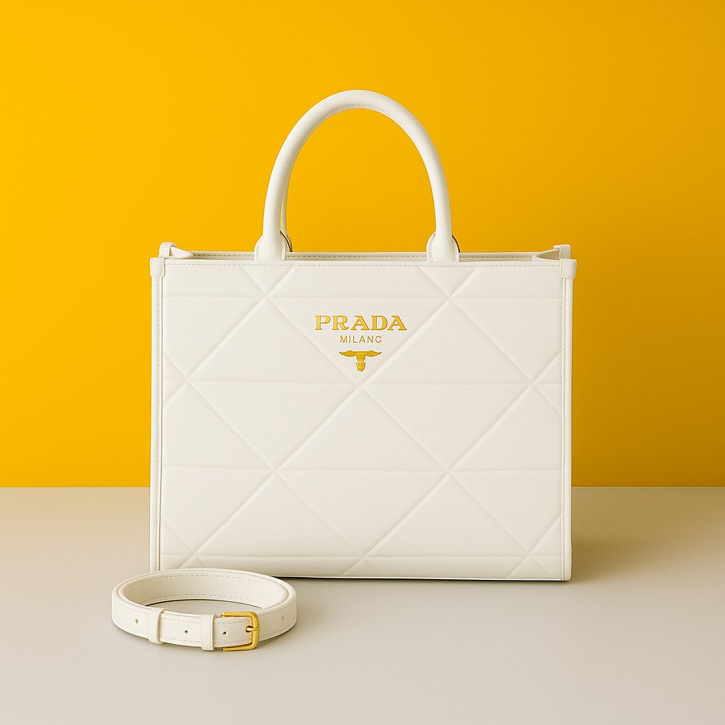 Elevate your style with the Leather Symbole Large Tote Bag, crafted in premium white leather with Prada’s iconic quilted Symbole pattern. This spacious tote combines elegance and functionality, making it perfect for both everyday use and special occasions.