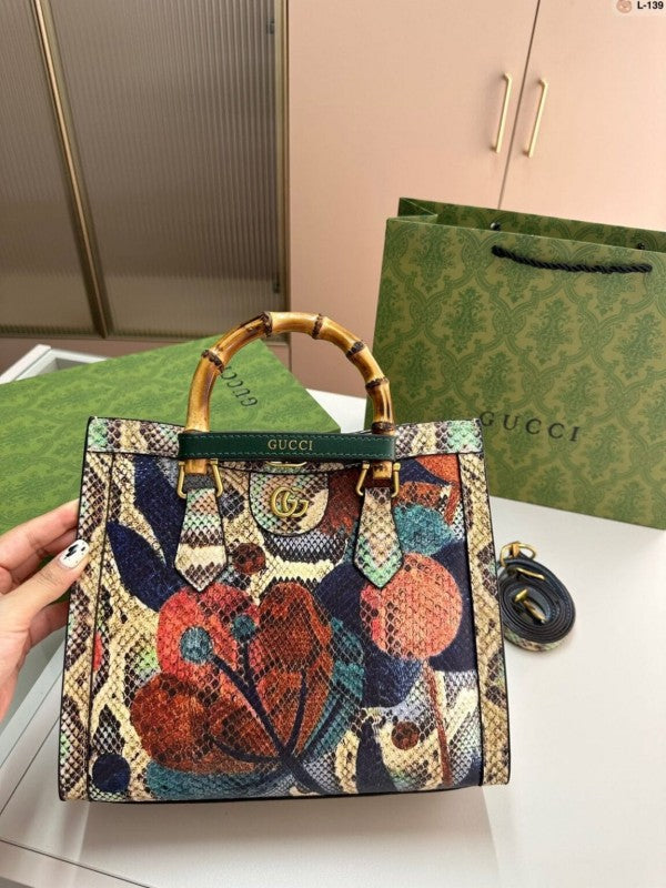 The Python Premium Tote Bag is a luxurious accessory that blends bold design with timeless craftsmanship. Made from premium python-effect leather, it features an intricate textured pattern in natural tones, highlighted by a striking mix of earthy and vibrant hues that make it stand out effortlessly. Its spacious structure offers ample room to carry daily essentials, while the sturdy top handles ensure both comfort and durability. Designed for those who appreciate exclusivity, this tote comes with its original magnetic box and a protective dust bag, making it a perfect blend of elegance, functionality, and collectability.
