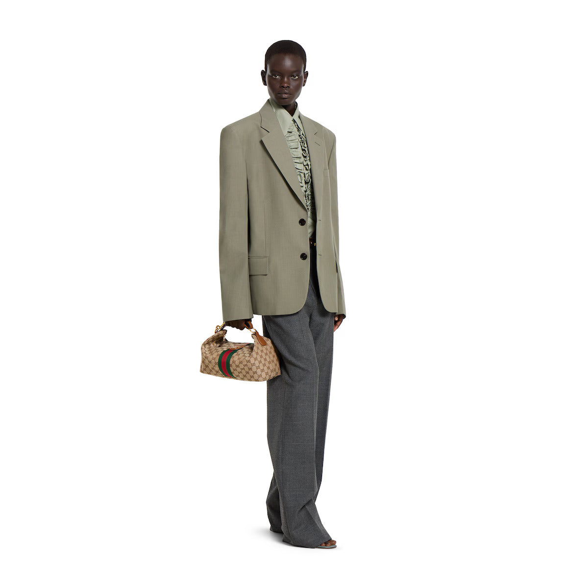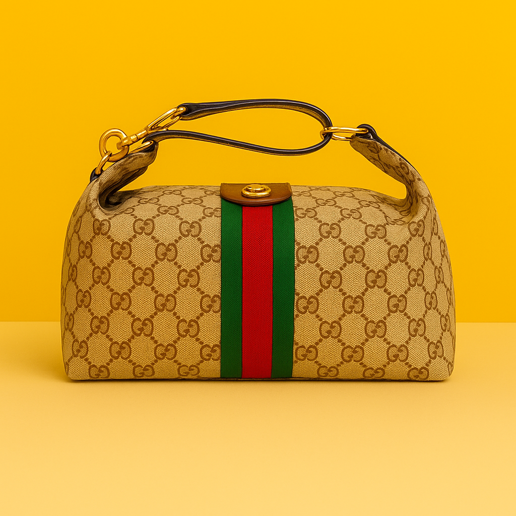 Elegance meets everyday functionality with this Vanity Medium Top Handle Bag in a classic brown tone. Designed with a structured silhouette, it features the signature monogram pattern that adds a touch of luxury to the overall look. The bold green-and-red web stripe enhances its timeless charm, while the polished gold-tone hardware elevates the bag’s premium feel.